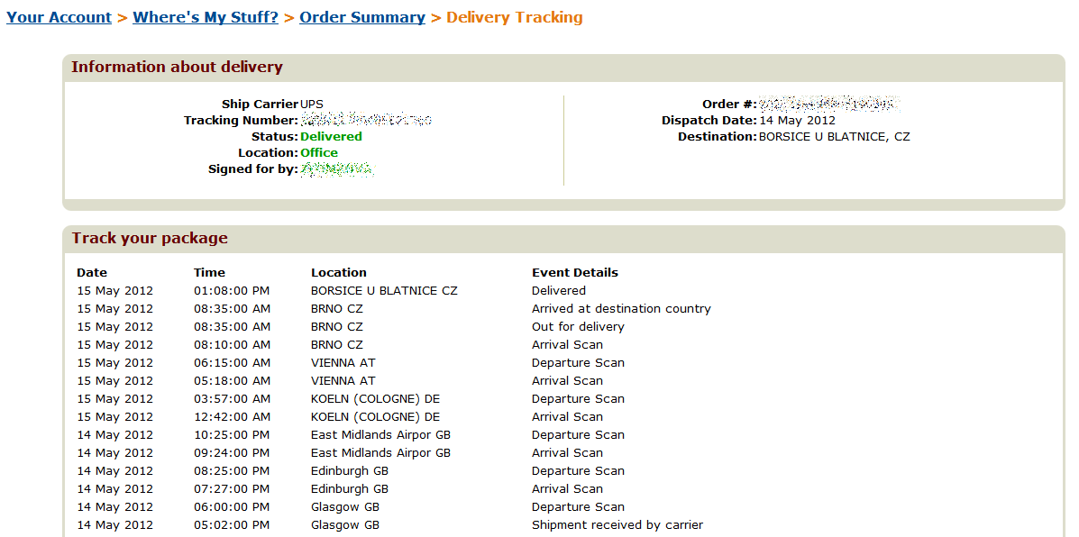 Takto vypadá status mé objednávky Collector's Edition z Amazonu. Ano, balík přišel za 20 hodin. Ano, z Anglie do díry na konci světa.