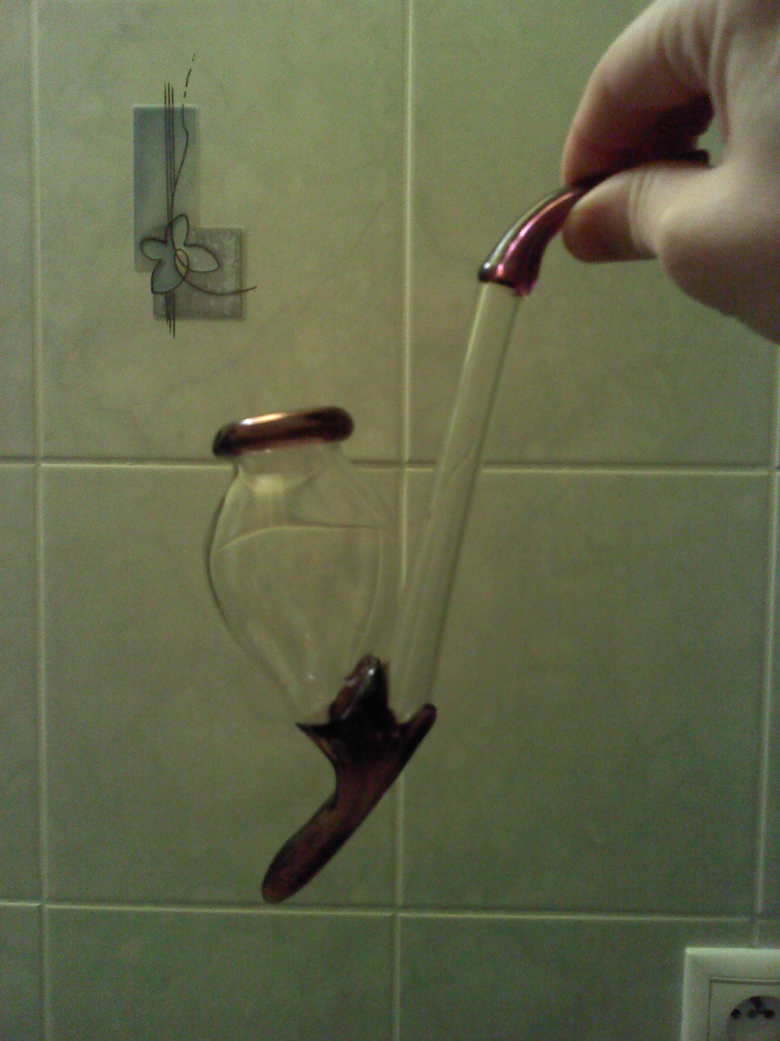 Tak sem byl u babicky a vsimnul sem si ve vitrince skleneny fajfky a projevil o ni zajem.. Tahle fajfka je minimalne 60 let stara a je urcena k popijeni silnejsich alkoholu (sama me pobizela at to vyzkousim a naleju si tam cognac :) ), po okraj naplnena ma objem neco malo pres 2dl. Kazdopadne mi ji babicka rada darovala, protoze u ni plnila funkci lapace prachu... Nejsem sice do tehle fajfek nejak moc zblaznenej, ale je to kazdopadne zajimavej artefakt :) Jinak moc se omlouvam za kvalitu fotek, ale je to cvakly narychlo mobilem - ta barevna cast je neco mezi temnou vinove rudou a fialovou...